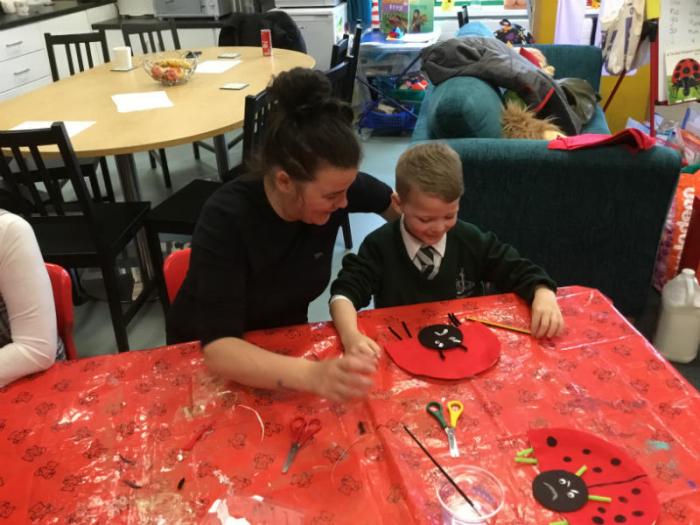 In ‘The Sunshine Room’  our new topic is ‘In the Garden!’  We are learning about plants, flowers and mini-beasts.  Last week we read the story of ‘The Bad Tempered Ladybird’ by Eric Carle.  In this story The bad-tempered ladybird  picks fights with all the animals it meets.  By the end of the story the bad-tempered ladybird realises that it is much better when you are in a good mood.  This morning we had a craft session with Ihintz,  from the Whiterock Children’s Centre, our parents and children making some very bad-tempered ladybirds using paper plates, felt, paint, pipe cleaners, wiggly eyes and glue!!!